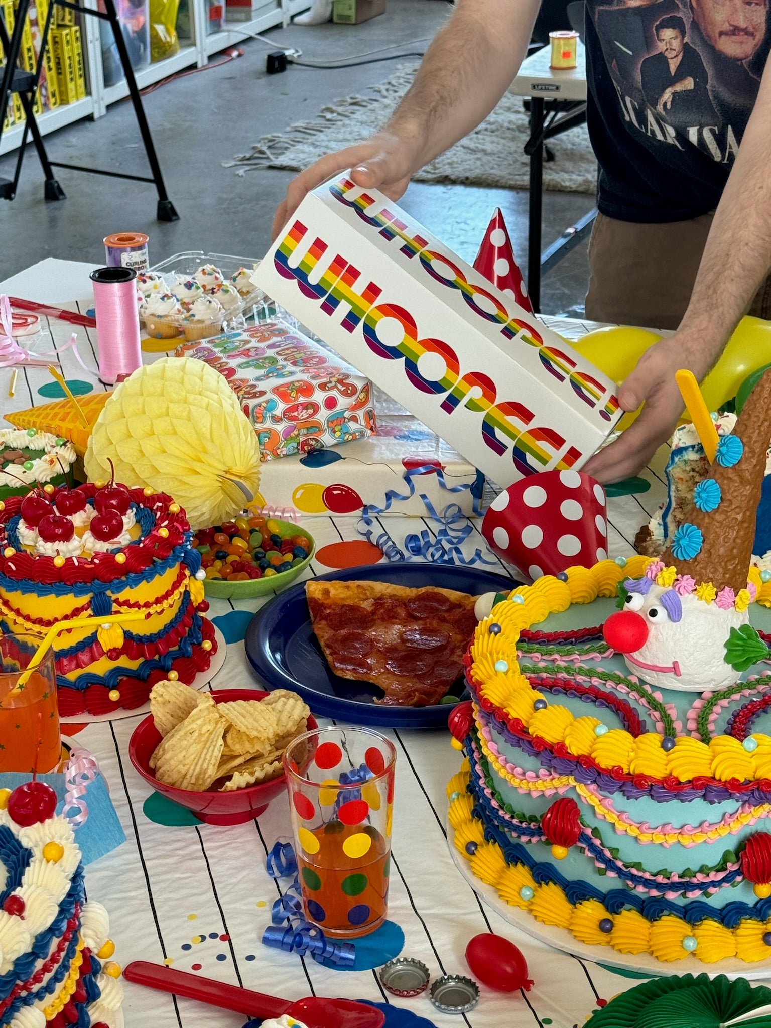Shop Happy BirthdayWe found some fun 70s party favors on eBay, like the ‘WHOOPIE’ gift box—chef’s kiss! We also got the tablecloth and some silly table decorations. We sourced props from our favorite local prop house, Prop Haus, and picked up some greasy NY pizza and orange soda. Additionally, we commissioned two hilarious ‘clown cones’ reminiscent of the classic Baskin Robbins ones, made our friend Beth Salvini of Greenwich Letterpress and Big Fun which really rounded out that 70s feel.