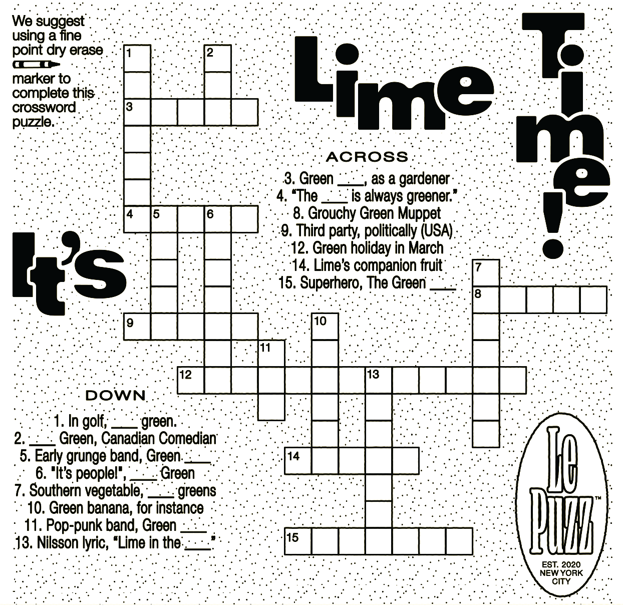 Free your mind from flat brain fatigue and test your knowledge of Lime and green themed people, places and other lime-y things with our Crossword. All of our puzzles come with extra games and activities on the back of the box, use a fine tipped dry erase marker to complete and easily wipe off.