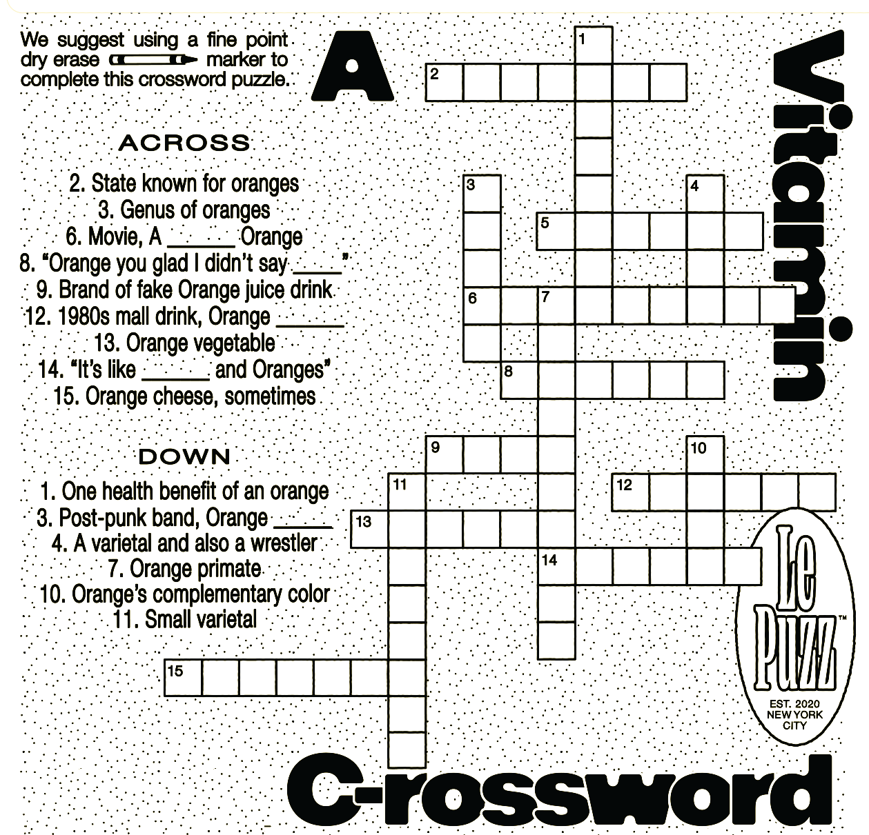 Free your mind from flat brain fatigue and test your knowledge of orange themed people, places and other orange-y things with our Crossword. All of our puzzles come with extra games and activities on the back of the box, use a fine tipped dry erase marker to complete and easily wipe off.
