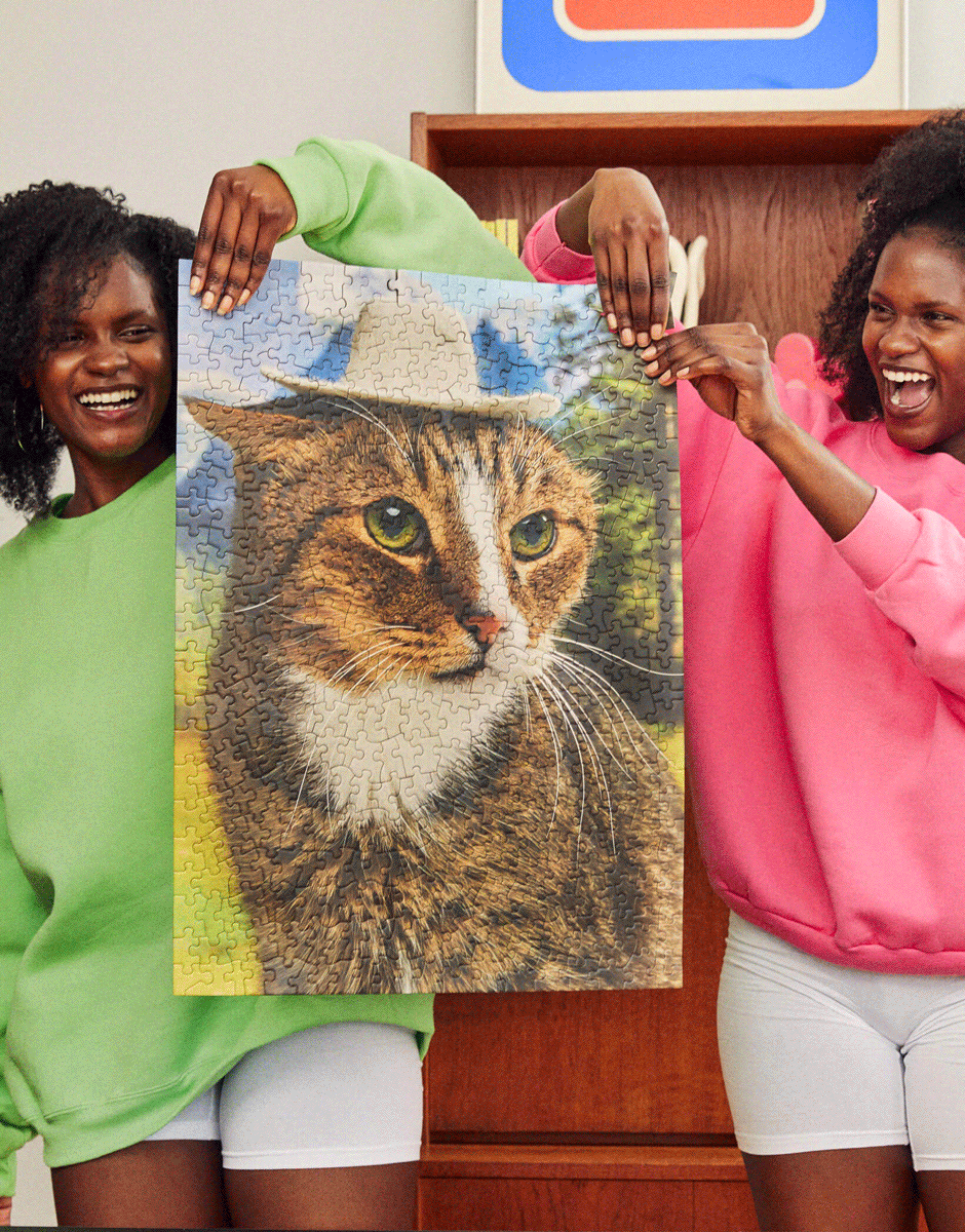 Howdy Paw—tner is our ode to the cat puzzle. Even dog people agree, this puzzle is the cat’s meow. Tiny hats and all this puzzle is 100% hypo-allergenic.