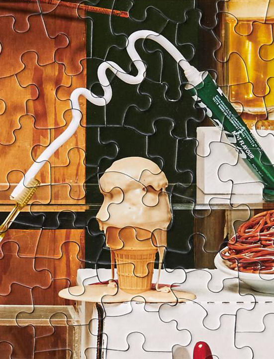 It may come as a surprise but no noodles, or milk, or soda, or toothpaste was spilled in the making of this puzzle. We (and by we I mean Alistair) have been collecting these wacky fake food oddities for years. You might have seen them on display at your local furniture shop faking a big-oops-moment. Seeing them together in all their hectic glory making one big beautiful oops moment is a real sight to behold. Just don’t lose any pieces or you’ll truly be in an oops moment of your own.
