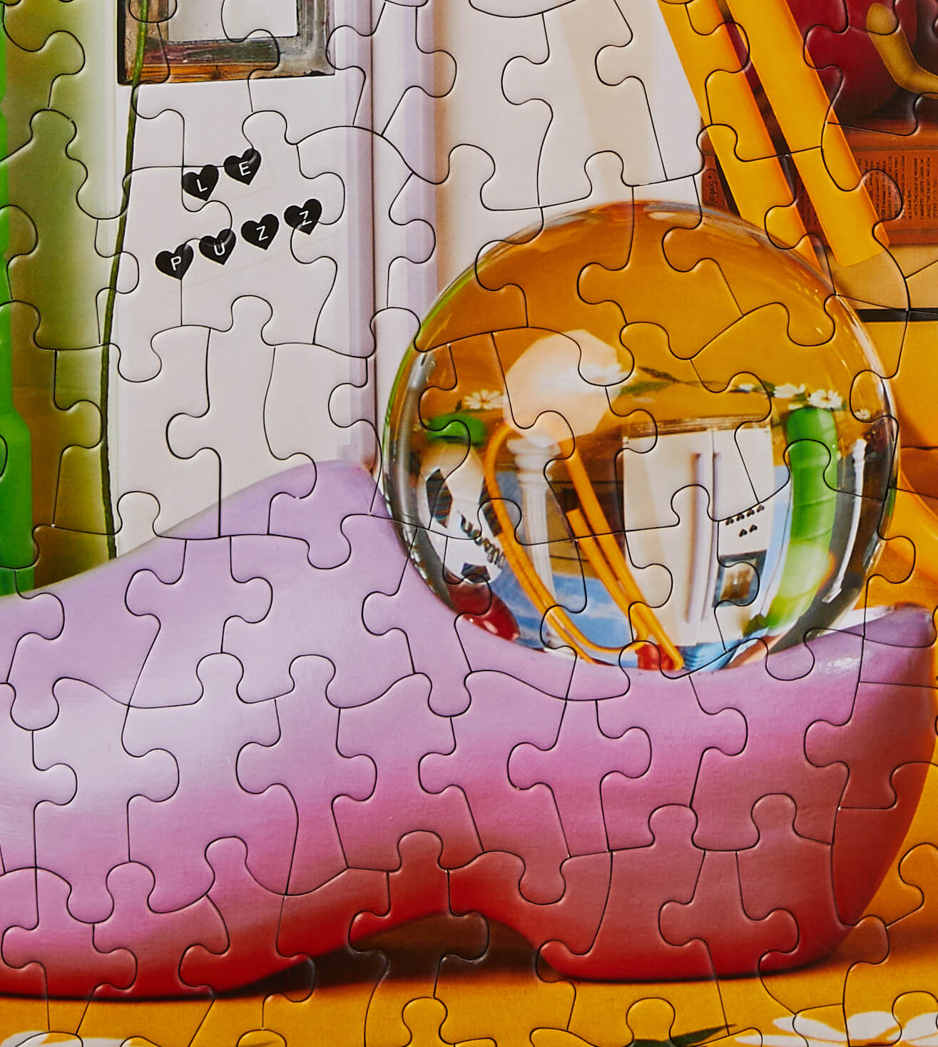 This puzzle features a mash-up of objects both big and small from our ever-growing pile of studio props, like this fake foot!