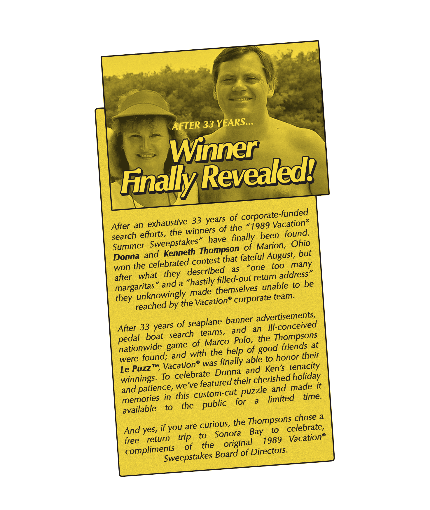 Time travel to 1989 with a limited edition collaboration between iconic, vintage-inspired puzzle makers Le Puzz and the “leisure-enhancing” sunscreen brand, Vacation® Inc! Created to honor Donna and Kenneth Thompson from Marion, Ohio, winners of the 1989 Vacation® Summer Sweepstakes, this nostalgia-fueled, “random-cut” puzzle will provide you and your family the perfect entertainment to enjoy during leisurely summer days.
